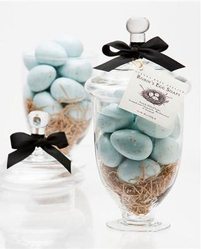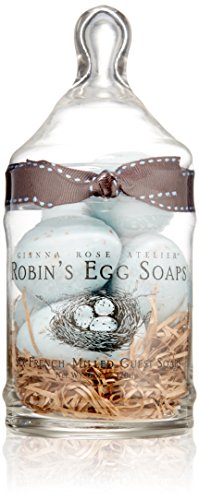 Sixteen of our classic Robin's Eggs are placed in a large glass apothecary jar to create the perfect bath or kitchen accessory. This vegetable based, french-milled soap is imbued with the soothing extracts of chamomile and meadowsweet. Oatmeal and wheat bran give these eggs their exfoliating speckles.