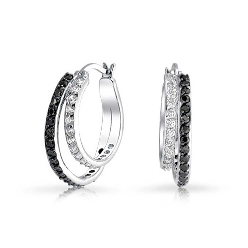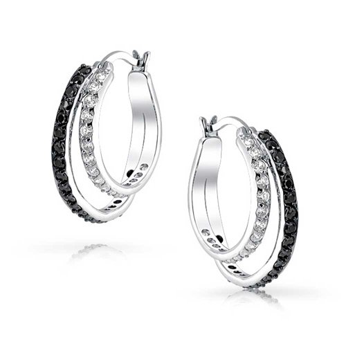 Calling all Single Ladies. These stunning cubic zirconia double hoop earrings are made of rhodium plating and cubic zirconias. These black and white hoop earrings are a perfect accessory to shine at your next ladies night out. Featuring double hoops; smaller hoop is dazzled in clear CZs, the larger hoop is embellished with black Simulated Onyx CZs. Wear them out, friends and look Fab. Get these blinging hoop earrings today.Feature