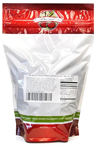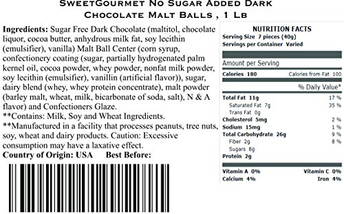 -. Binding : Misc. -. Brand : SweetGourmet -. Feature : Net Wt.: 1Lb, Kosher Certified / No Sugar Added Dark Chocolate Malt Balls / A melt in your mouth candy, these chocolate treats are great as a snack or as a topping for ice cream sundaes. Better yet, these malt balls have a sweet chocolate taste without any added sugar! / Country of Origin: United States / Crunchy malt balls are dipped in decadent dark chocolate to make this traditional malt ball treat. -. Label : SweetGourmet -. Manufacturer : SweetGourmet -. ProductGroup : Grocery -. ProductTypeName : GROCERY -. Publisher : SweetGourmet -. Size : 1Lb -. Studio : SweetGourmet -. Title : SweetGourmet NO SUGAR ADDED Dark Chocolate Malt Balls, 1Lb
