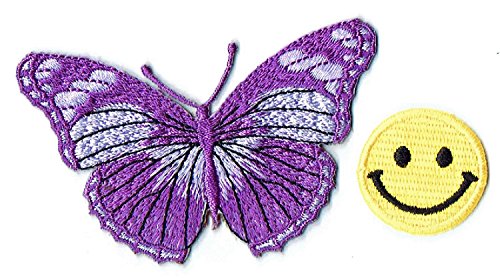 -. Title : "PURPLE CUTE BUTTERFLY" Applique embroidered iron on PATCHES (Wappen, ワッペン , 패치) with Yellow Tiny Smiley Patches by PATCH CUBE
