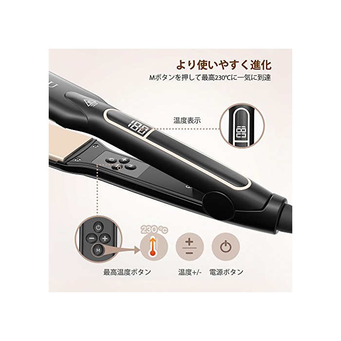 프로 사양의 230°C:설정 온도는 130°C~프로 사양의 230°C까지!완고한 버릇모도 마음 내키는 대로 스타일링.자신의 발질 에 따라 10℃씩 온도를 조정 할 수 있기 때문에,한층 더 데미지를 경감 할 수 있는.