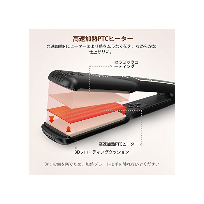 와이드 플레이트:42mm의 와이드 플레이트를 채용,많은 머리를 제대로 사이에 두어 보통의 스트레이트 아이런 보다 노동시간단축으로 머리를 스트레이트로.머리의량이 많은 분에게 꼭 추천.