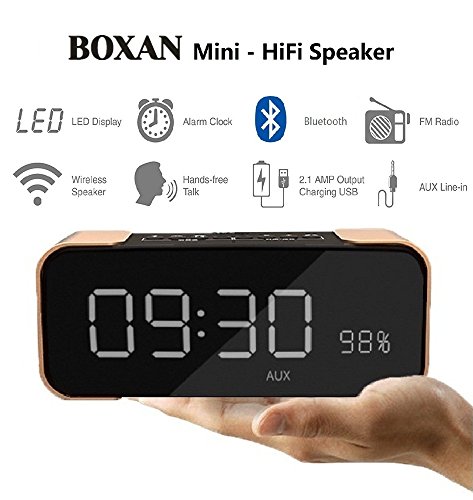 PACKAGE CONTENTS - BOXAN Portable Wireless Bluetooth Speaker with Alarm Clock x 1, USB Charge Cable x 1, Aux 3.5mm Audio Cable x 1, Instruction Manual x 1
