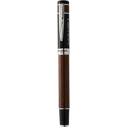 -. Feature : Balmain Paris Bellasino Matte Black Barrel with Faux Wood Detailing Ballpoint Pen Black Ink / Matte black barrel with faux wood detailing and stark contrast shiny chrome accents. / Black Ink, With gift box. / Dimension: 5.4" X 0.5". Material: Brass