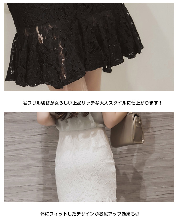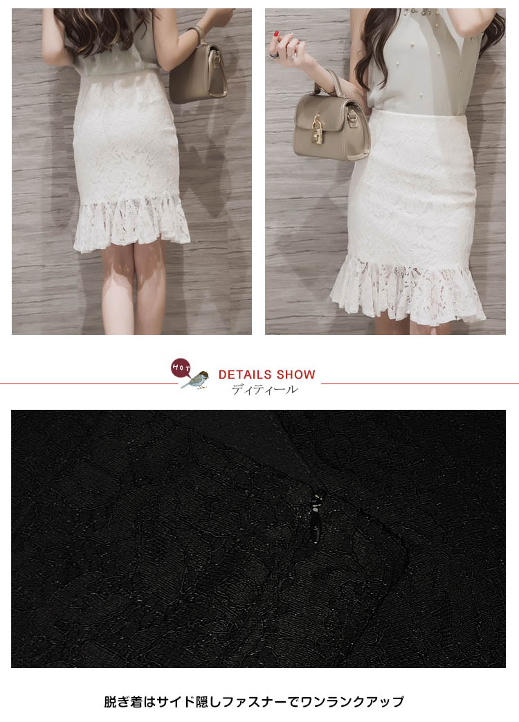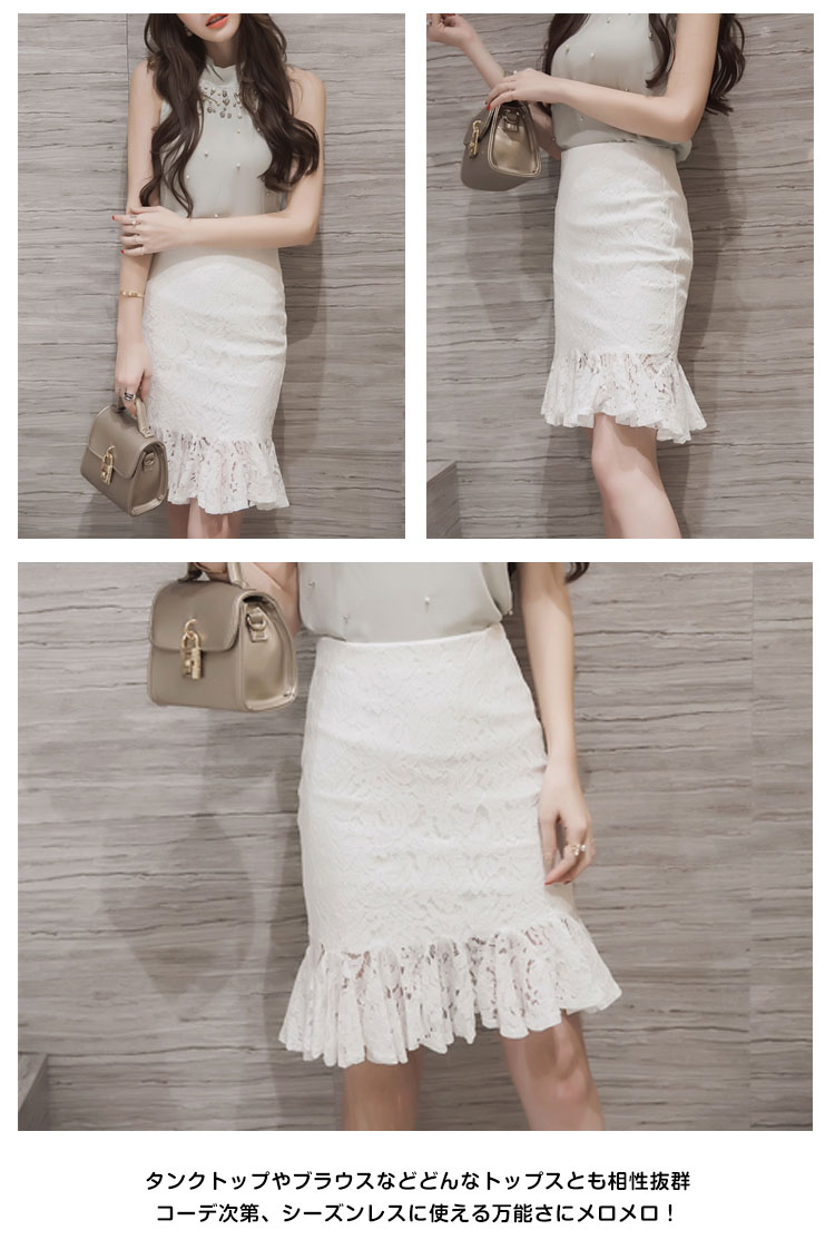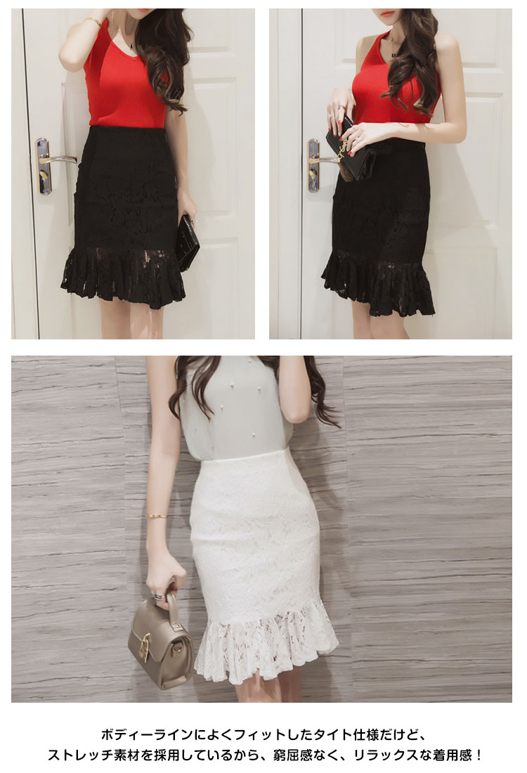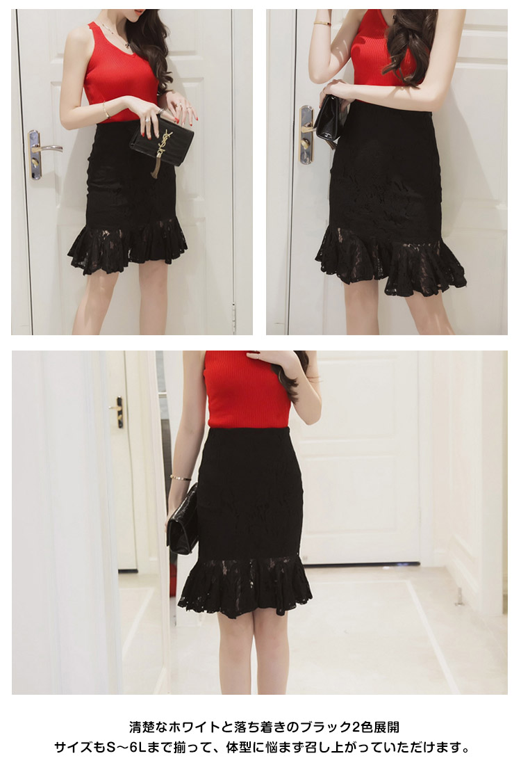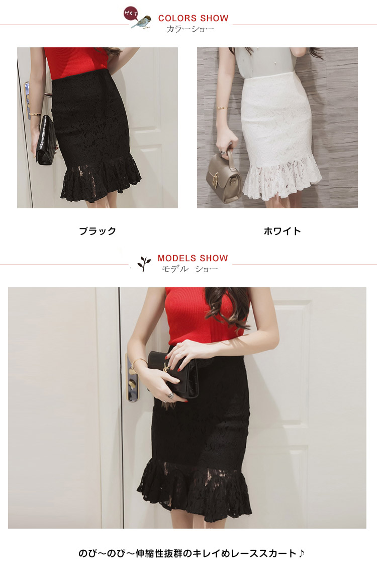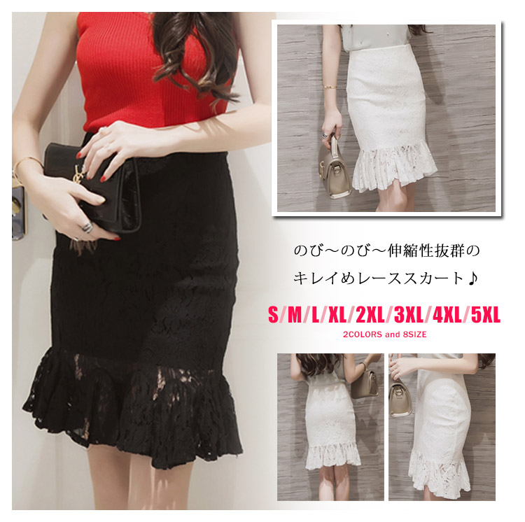 | のび?のび?伸縮性抜群のキレイめレーススカート♪清楚なホワイトと落ち着きのブラック2色展開サイズもS?6Lまで揃って、体型に悩まず召し上がっていただけます。ボディーラインによくフィットしたタイト仕様だけど、ストレッチ素材を採用しているから、窮屈感なく、リラックスな着用感!タンクトップやブラウスなどどんなトップスとも相性抜群コーデ次第、シーズンレスに使える万能さにメロメロ! | |