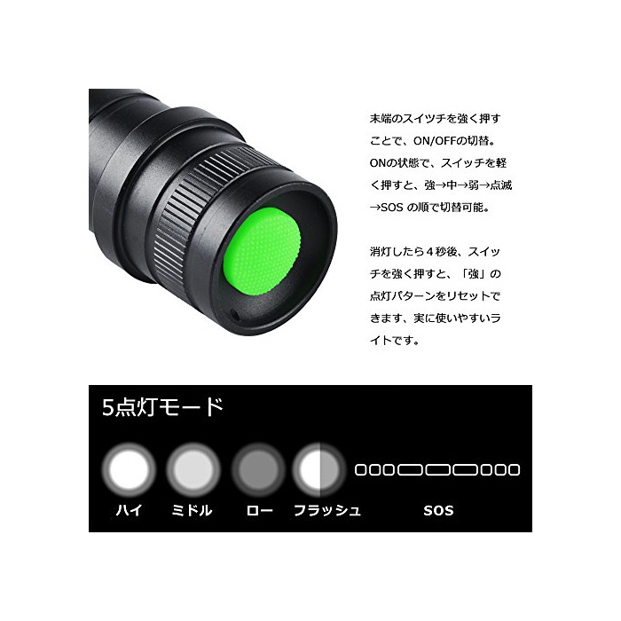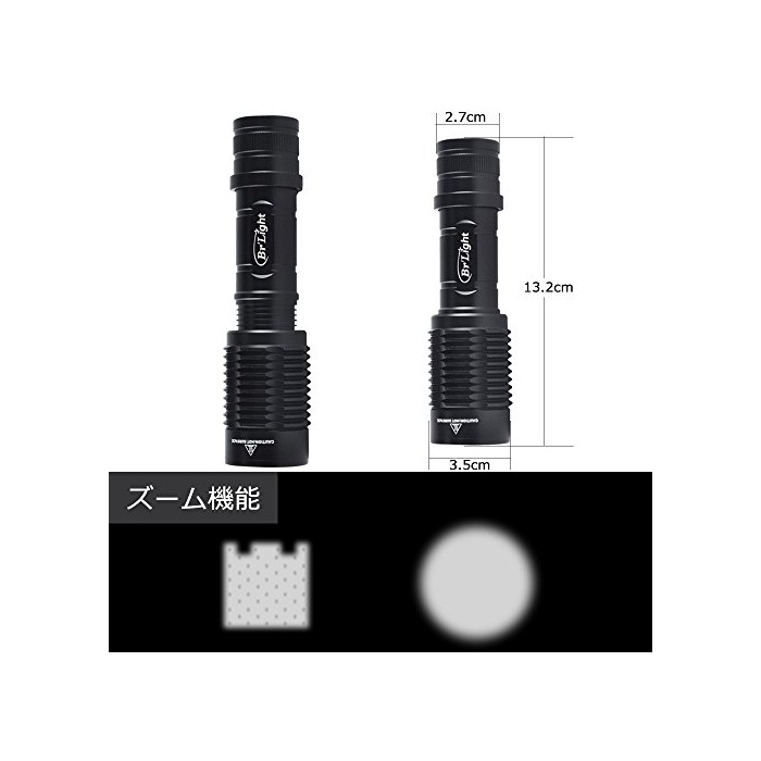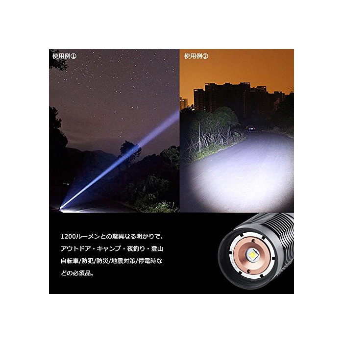 XM-L2 LED:미국CREE사제XM-L2 LED를 탑재하고, 1200루멘의 밝기 상당,조사 거리가 약300~500미터.아웃도어 캠프 등산 방범 방재 지진 대책 정전 시 등의 필수품!