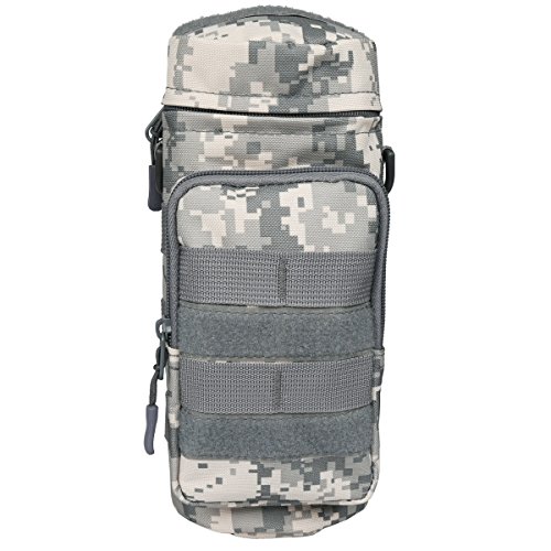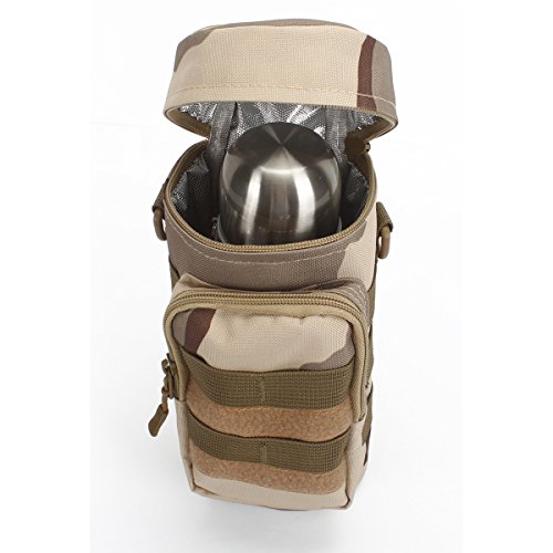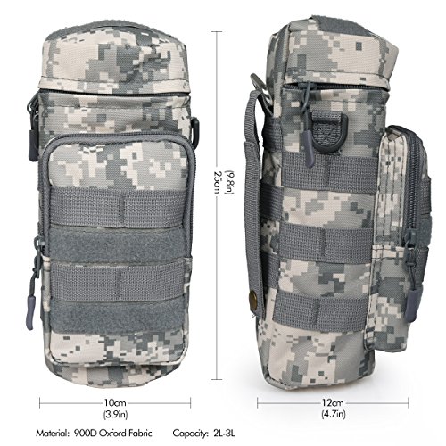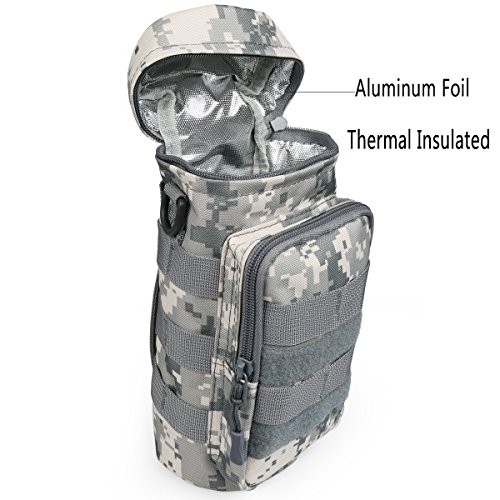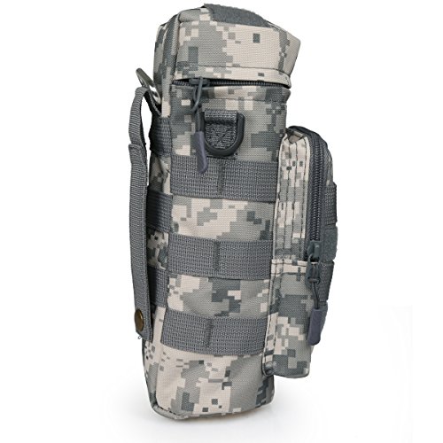 -. Feature : ★DESIGN--ZIPPER POCKETS:1 Water Bottle Pouch + 1 Front Accessory Pouch for storage and organization,can fit iPhone 6 Plus, credit cards, keys, changes, flavor packets and other essentials,with an adjustable padded shoulder strap ,Shoulder strap and zippered side pockets keep everything you need within hands reach at all times.the thermal insulation water bottle sleeve can fits most water bottles (20oz - 40oz) , 9.8 inch(Height) x 4inch (Diameter). / ★MATERIAL--WATERPROOF OXFORD FABRIC,Our tactical water bottle pocket is made of premium 900D oxford fabric material,and use three layer process,900D Oxford fabric+EPE+Aluminum Foil,makes the pouch more heat retaining,durable and waterproof,it's available to against rainy, snowy, dusty and other harsh environment. / ★FUNCTION--Molle compatible system Offers a secure, tight fit when attached to any Molle gear tighten the hydration carrier solidly, preventing water weight gravity from pulling the pouch downwards or from flopping around when walking or jogging. / ★APPLICATION--Hanging in the main backpack with two buckles,One Shoulder or waist pack. / ★PACKAGE INCLUDED--Only include water bottle pouch,the water bottle and other decoration accessories are not included. Package includes: 1 * water bottle pouch.