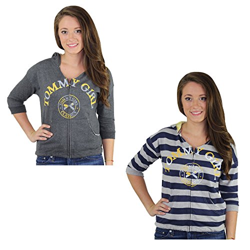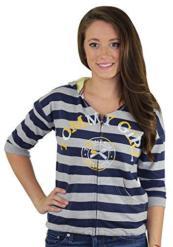 - Feature : Tommy Girl 2014 Collection / Varsity inspired zip up hoodie with 3/4" sleeves / Drawstring waist that ties at back / Yellow and white stripe lined hood / 60% Cotton, 40% Polyester
