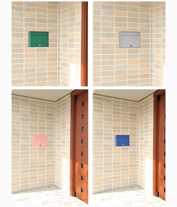 門扉や壁に掛けるタイプのおしゃれカラーポスト。A4用封筒やA4回覧板の大型郵便物がらくらく投函。ダイヤル錠付で防犯性にも優れています。 |