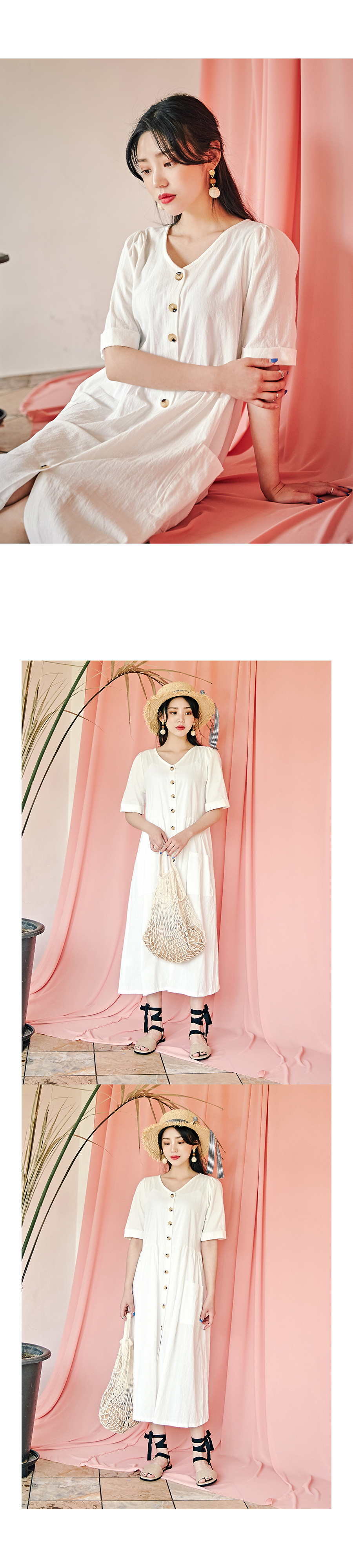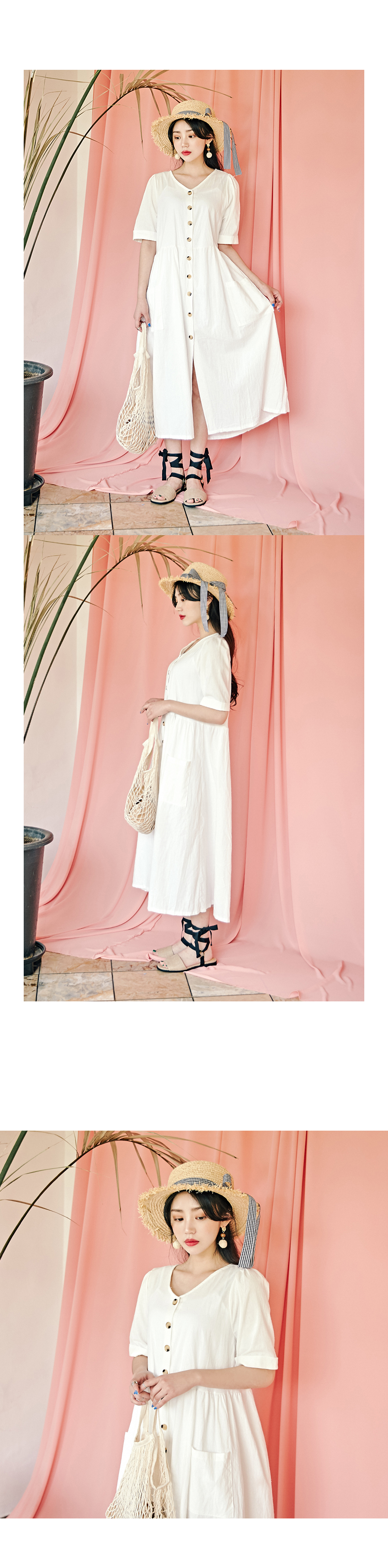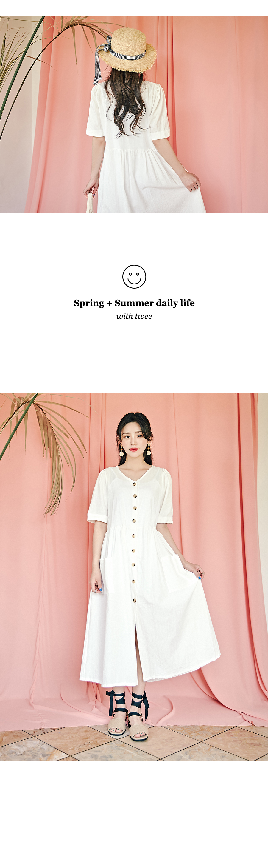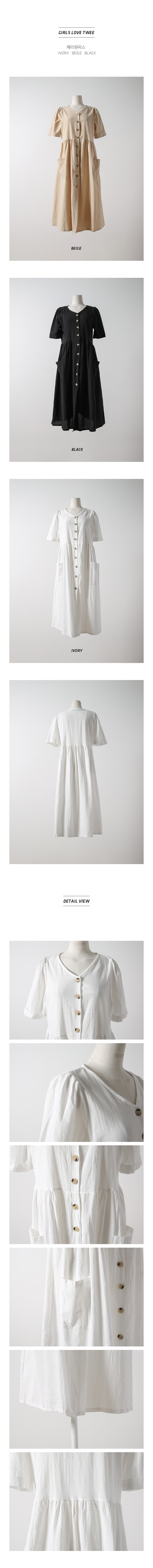 MD COMMENT페미닌하면서도 소녀감성을 더해주는롱원피스 입니다 전체적으로 여유있는 실루엣으로 부담없이 편안하게 즐기실 수 있어요 V네크라인으로 목선을 여리여리하게 연출을해주며 종아리를 덮는 길이로 바디라인을 커버해주구요단추디테일로 쉽게 착용하실 수 있는 아이템이에요 !