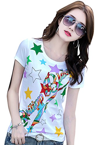 -. Title : (チョロモ) Cholmo レディース Tシャツ 半袖 ラウンドネック スリム かわいい カラフル 星 スター ダイヤストーン (L, 白)