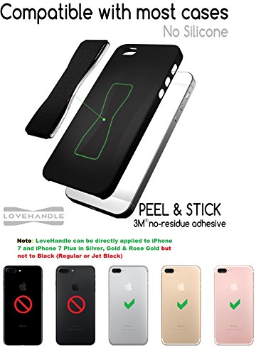 The LoveHandle® Universal Grip (original SlingGrip) is a smartphone and tablet grip attachment that adheres to the device using a strong but removable no-residue 3M® peel-n- stick adhesive. Featuring a patented slim-profile pocket-friendly design that won't get in the way, the LoveHandle enables users to securely hold their devices without the risk of dropping them. The LoveHandle is great for taking crisp photos (particularly selfies!) and steady videos, and makes one-handed phone use much easier. It also allows you to flip your phone around to the back of your hand, allowing you to carry additional items while keeping track of your phone. In addition, using a LoveHandle to help you hold on to your phone can be quite helpful when jogging, biking, and at just about any other time you don't want to drop your phone. Our customers tell us that the LoveHandle becomes an indispensable part of their device within the first 30 minutes of using it. Why don't you give the LoveHandle a try for yourself! COMPATIBILITY NOTES: Cases: The LoveHandle is not compatible with silicone cases such as the Apple Silicone Case or gel cases. TPU cases should work well. Please contact us if you're not sure if your case is compatible. Phones: If you have an Apple iPhone 7 or Apple iPhone 7 Plus that is Black (often referred to as Matte Black) or Jet Black, the LoveHandle should be used with a compatible case to ensure optimal adhesion. The LoveHandle is not compatible with glass back phones such as the Samsung Galaxy S6 or soft back phones such as the Samsung Galaxy Note 4 and Motorola Droid Turbo 2. We suggest using the LoveHandle on a compatible case for your phone.Feature