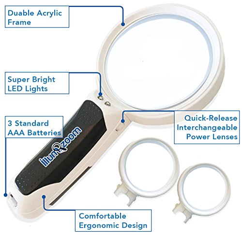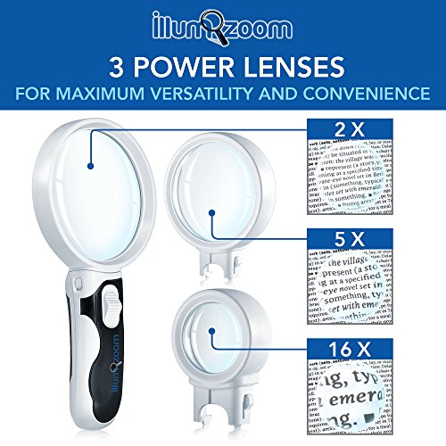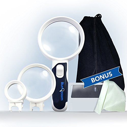 Premium Magnifying Glass Set with LED Lights, Best Handheld Portable Magnifier with Illuminated Heads. 2.5x, 5x, 16x Set Includes Credit Card Size Magnifier, Carry Bag, and Cleaning Cloth