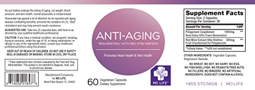 MD LIFETM ANTI-AGING RESVERATROL WITH RED VITIS VINIFERA enhances skin texture by helping to reverse DNA damage, therefore reducing fine lines and wrinkles. It also acts as a natural sunscreen and is formulated to resist harsh stomach acids for better absorption and more effective results.