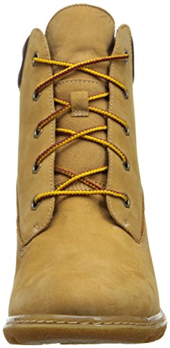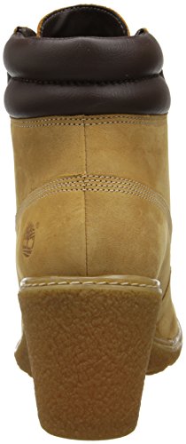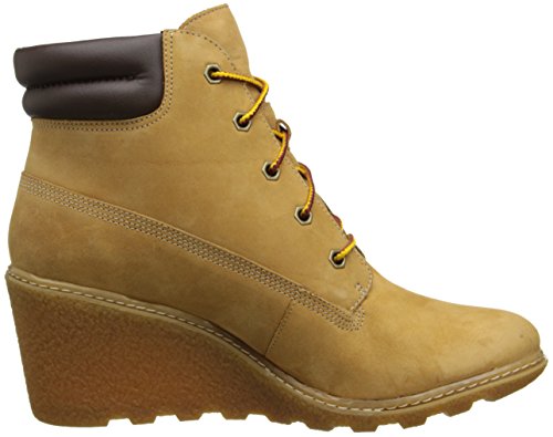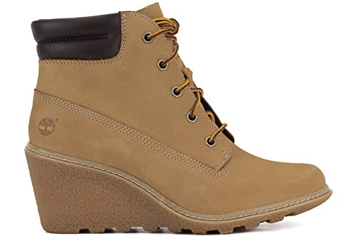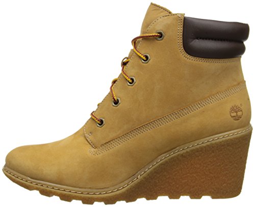 FEATURES of the Timberland Women's Amston 6 Inch Boot Premium nubuck leather upper from an LWG Silver-rated tannery for comfort, durability and long-lasting wear Lace-up style for an inspired classic look Padded collar for a comfortable fit around the ankle 100% Recycled pet mesh lining and footbed cover made from recycled plastic bottles is comfortable, breathable and environmentally conscious Natural latex footbed for superior comfort Durable and textured wedge heel and rubber lug outsole (15% Recycled rubber) for maximum traction Wedge Heel Height: 2 3/4" / 7 cmFeature
