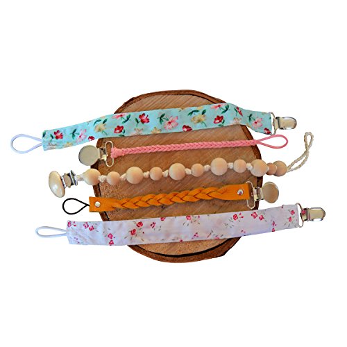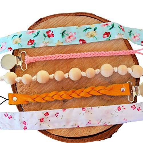 -. Title : Pacifier Clip Braided Leather, Wooden and Cotton Pacifier Holder Strap Clip Nookie Assorted Variety - Girls 5 pack