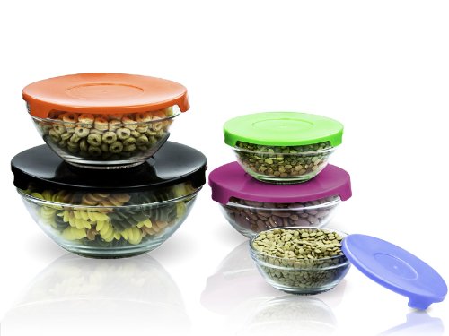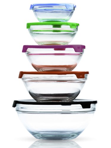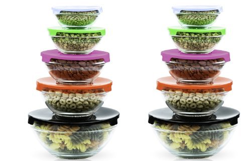 Stackable Glass Lunch Bowls / Multi Purpose Food Containers with Multi-Color Lids - 10 Piece Set (2 Pack)