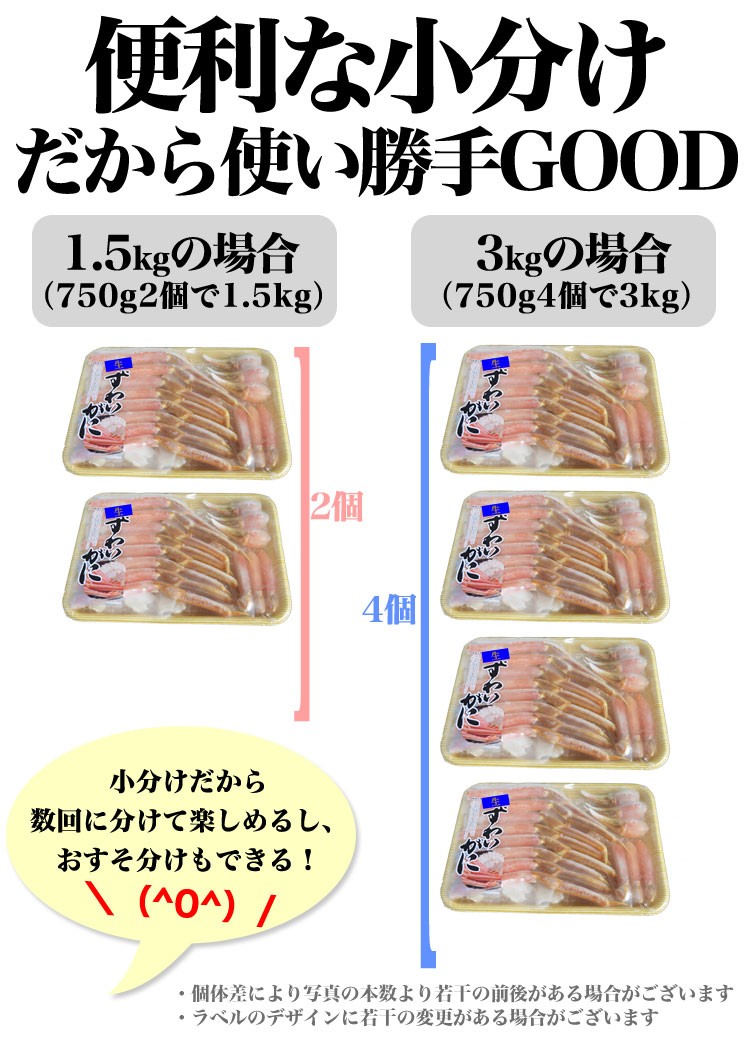 必ず火を通してから召し上がり下さい。生のカニ身は解凍状態で時間が経つと酸化し黒ずみます(黒変)