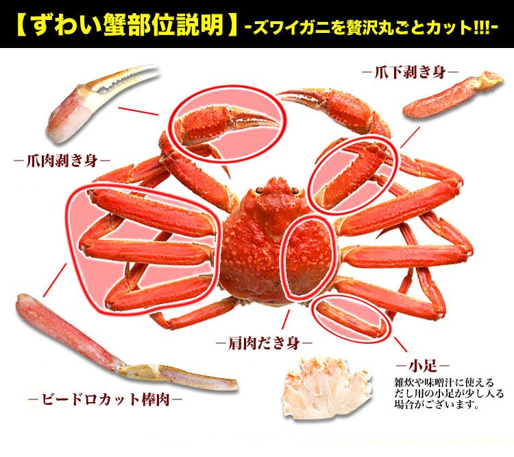 ■原材料:ズワイガニ(ロシア・アラスカ・米国・カナダ・ノルウェー・ラトビア)、酸化防止剤(亜硫酸塩)