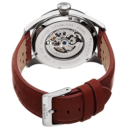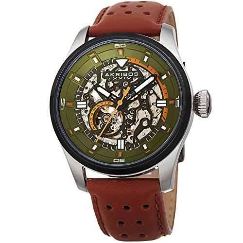 -. Title : Akribos XXIV Men's Automatic Skeltonized Green & Brown Perforated Leather Strap Watch - AK1010BR