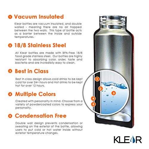 Klear water bottles are made of premium food grade double walled 18/8 stainless steel. High quality powder coated for the smooth matte finish. Advanced thermal technology keeps cold drinks cold and hot drinks hot longer then ever before. With ZERO toxins and flavors, we take great pride in our work. 100% BPA and phthalates free, we wouldn't offer anything less. Klear Bottles are available in 3 sizes: 32oz, 40oz and 64oz in multiple colors.
