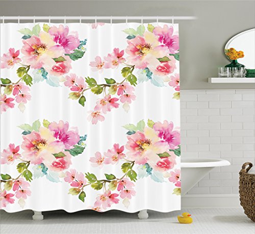 Ambesonne Flower House Decor Collection, Springtime Colorful Pastel Blooming Watercolor Wildflowers and Leaves Pattern, Polyester Fabric Bathroom Shower Curtain Set with Hooks, White Pink Green