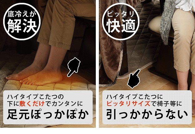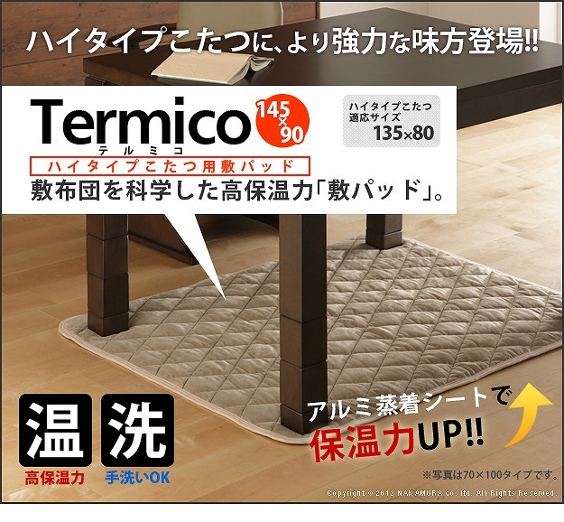 商品について:アルミシート入りのダイニングこたつ用の敷パッド。アルミシートが熱を反射するので、熱が逃げにくく保温力UP。敷くだけで底冷 え解消!足元ぽっかぽかに♪ピッタリサイズなのでイス等に引っかからず快適にご使用頂けます。
