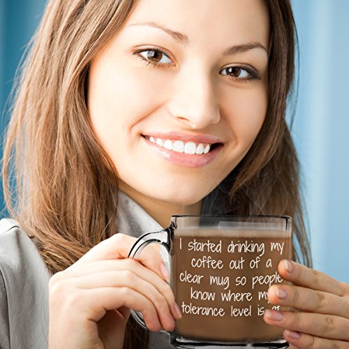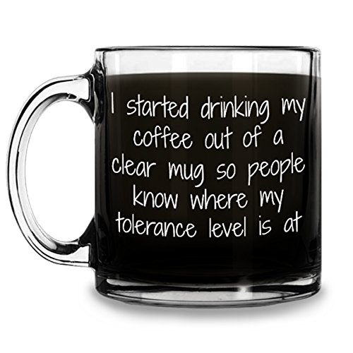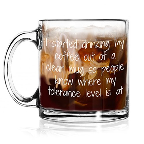-. Brand : Jolly Mugs -. Color : Clear -. EAN : 0757572995547 -. Feature : KEEPING OTHERS SAFE - Early mornings are simply not times to talk. In fact, sometimes it's better not to say anything and carry a cup that lets the waking world know to stay out of your way. This is a cup made just for those moments. / COFFEE, TEA, CAFFEINE - No matter what it is that you drink in the mornings, be it steeped tea, cappuccino or a little coffee with a lot of Jack Daniels, our solid, durable and uniquely funny cup will help set the tone. / WORK APPROPRIATE - Whether you work at a Fortune 500 company or you own your own hair salon, our fun glass mug is appropriate for any setting. And if anyone asks, just point at the mug and shake your head very slowly. / DISHWASHER FRIENDLY - Clean up quickly and easily. Add it to the top rack and wash it out now and again so it'll be ready when you need it most. / SATISFACTION GUARANTEED - If you simply aren't tolerant of your "Tolerance Level" coffee mug and want a replacement or a refund, send a message and we'll make sure it all gets sorted out. Just drink your coffee first. -. Label : Jolly Mugs -. Manufacturer : Jolly Mugs -. MPN : TOL LEVEL -. NumberOfItems : 1 -. PackageQuantity : 1 -. PartNumber : TOL LEVEL -. ProductGroup : Kitchen -. ProductTypeName : KITCHEN -. Publisher : Jolly Mugs -. Studio : Jolly Mugs -. Title : Tolerance Level Funny Glass Coffee Mug -. UPC : 757572995547