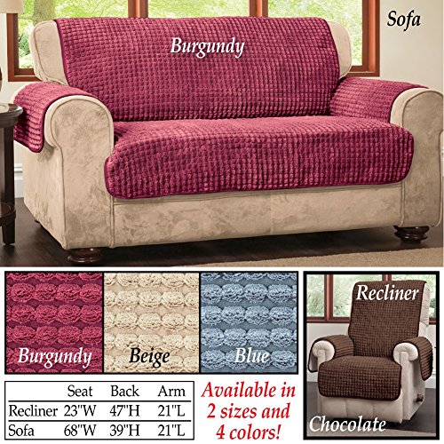 -. Feature : Protect your furniture from wear and tear, pet hair and more with these attractive, quilted furniture covers. / Covers are crafted in comfortably soft and durable chenille fabric. / Machine washable. / Polyester, nylon and olefin. / Colors available in Blue, Burgundy, Beige or Chocolate. Sizes available to fit either a Recliner or a Sofa.
