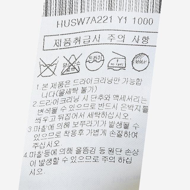 세탁방법 및 취급시 주의사항 1.본 제품은 드라이크리닝만 가능합니다.(물세탁 불가) 2.드라이크리닝 시 단추와 액세서리는 변색될 수 있으므로 반드시 은박지를 씌우고 뒤집어서 세탁하십시오. 3.마찰에 의해 보푸라기가 발생될 수 있으므로 착용후 가볍게 손질하여 주십시오.