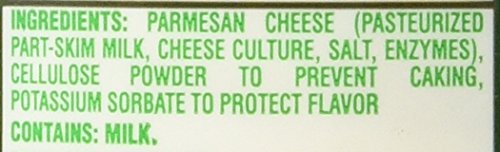 24 ounce size w/ Flavor Lock Cap100% real grated parmesanNo fillersRecipe ideas on packageIdeal for food serviceIngredients: Parmesan cheese (pasteurized part-skim milk, salt, less than 2% of enzymes, cheese culture, cellulose powder to prevent caking, potassium sorbate to protect flavor).Aged 6 months.Feature