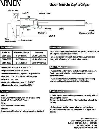 VINCA DCLA-0605 Digital Caliper is a higher quality and lower price digital caliper. It is highly recomended for home DIY using as well as professional using. The measuring Range is 0-6 inch/150mm. Its accuracy is ±0.001"/0.02mm and Repeatability is 0.0005"/0.01mm which is same as the resolution. The max Measuring Speed that allowed is 120" per second. It has a large LCD screen (13mm x 38mm) in Inch/mm conversion. VINCA DCLA-0605 comes with two 1.5V, LR44 batteries in the case. Please NOTE that DUE TO SHIPPING SAFETY, THERE IS NO BATTERY INSTALLED IN THE DIGITAL CALIPER, CUSTOMER NEEDS PUT IN ONE 1.5V, LR44 BATTERY BEFORE USING. Please also NOTE that IN ORDER TO OBTAIN A MORE ACCURATE MEASURING RESULT, PLEASE USE A SMALL PIECE OF PAPER OR PAPER CARD TO CLEAN THE EXTERNAL JAWS EVERYTIME BEFORE USING! VINCA DCLA-0605 DIGITAL CALIPER HAS AUTO-OFF FUNCTION AND IT TAKES 5-7 MINS TO SHUT OFF. VINCA DCLA-0605 HAS 1 YEAR WARRANTY. For more information please follow us on Instagram @officialclockwisetoolsinc.Feature
