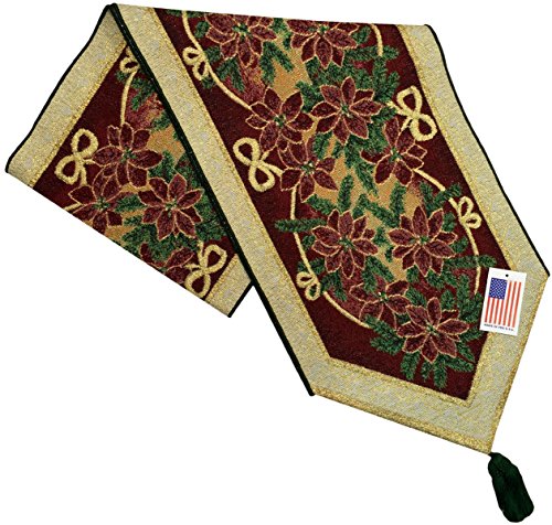 - Manual Christmas Star Poinsettia Ribbon Unlined Woven Tapestry Tablerunner UCST72 in shades of red, green and gold