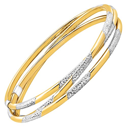 Bring your outfit full circle with this fun bracelet. Three thin, interlocking bangles are crafted in 14K gold-bonded sterling silver with dashes of sterling silver around the edges. Piece measures 8 inches in circumference.Feature
