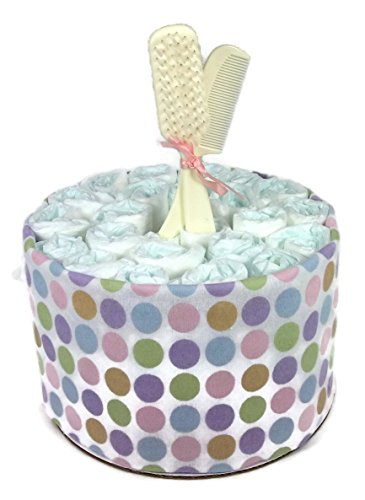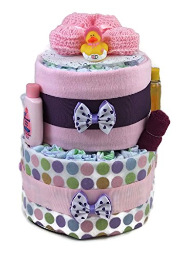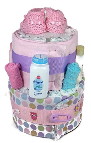 This diaper cake is made with 32 usable diapers. All of the Luvs diapers are rolled and banded, making it easy to take the cake apart when diapers are needed. Also, all of the Luvs diapers can be used - none were destroyed while making the cake. Included with the diaper cake is: 2 receiving blankets (assorted patterns, 30 in.. X 30 in.), a onesie (size 0 to 3 months, assorted patterns), 3 (assorted colors) washcloths, a comb and brush set, Johnson & Johnson baby powder (1.5 oz.), lotion (1 oz.), shampoo (1.5 oz.), and body wash (1 oz.). The cake is wrapped in ribbons and bows and expertly decorated. The diaper cake is topped off with a cute pair of pink, crocheted booties. This functional yet attractive diaper cake makes the perfect shower gift or centerpiece.The diaper cake is 2 tiers and stands 12 inches tall and has a round 8 inch base.