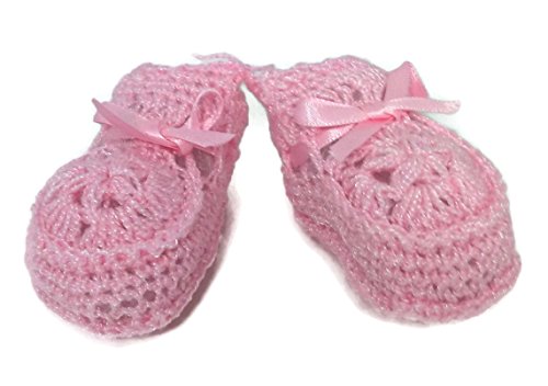 This diaper cake is made with pink colors and comes topped with a pair of crocheted booties