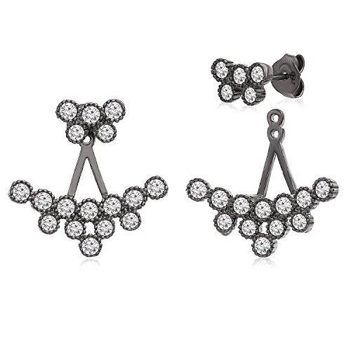 Our front to back 2 in 1 earring set has an edgy and modern look made from sterling silver with a high shine finish. This set can be either worn together or separately; a single stud earring attaches and securely holds a cluster of 12 cubic Zirconia stones along your ear lobe. This design gives a modern vibe to formal earrings. Be prepared to amaze and impress with this new twist.Feature