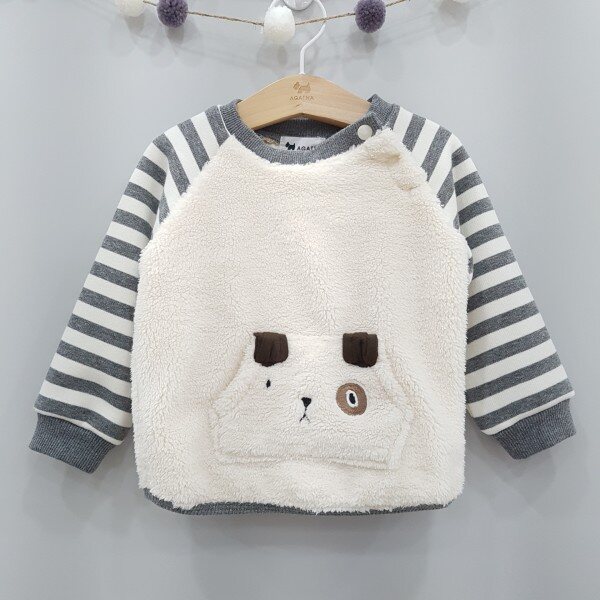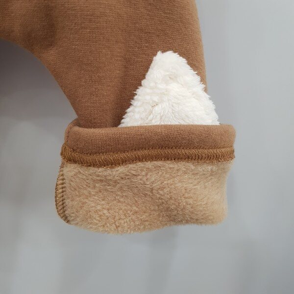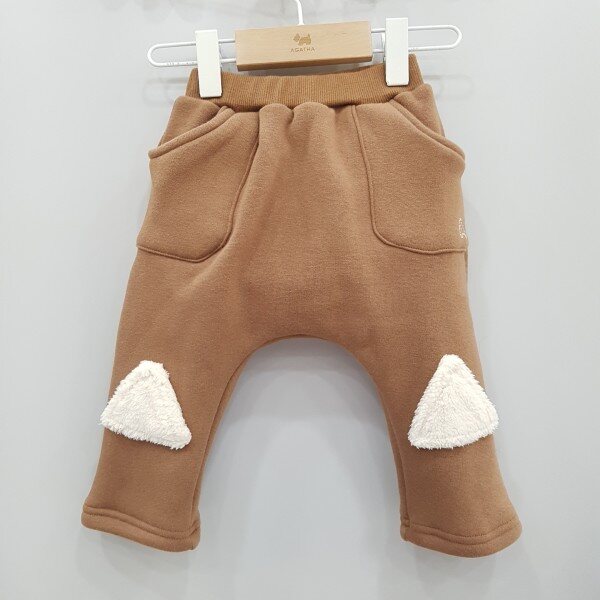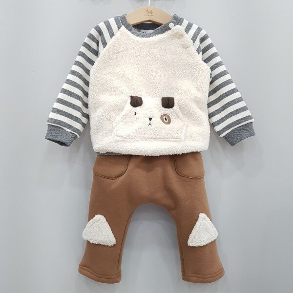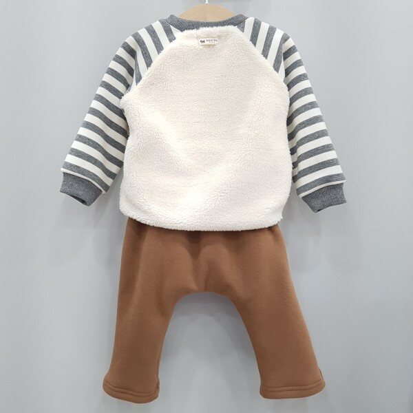 강아지 캥거루 포켓으로 포인트를 준 퍼 맨투맨과 삼각 무릎패치가 포인트로 들어간 기모 져지 스판 팬츠로 구성되어있습니다.