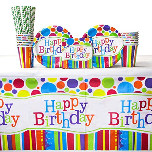Bright and Bold Party Supply Pack for 16 Guests: Straws, Dessert Plates, Beverage Napkins, Cups, and Tablecover (Bundle for 16)