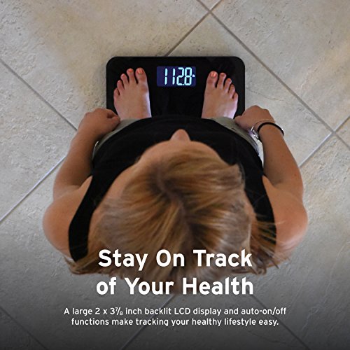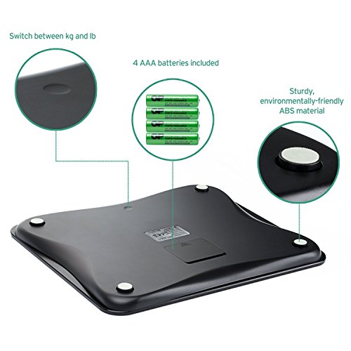 -. Feature : TAKE CONTROL OF YOUR HEALTH: Utilize step-on technology to receive immediate and accurate results, and take your first steps towards your new healthy habits. Measure anywhere from 18 - 440 lb (8 - 200 kg) with a 0.2 lb /3oz; includes a FREE body measuring tape to monitor progress. / EFFORTLESSLY TRACK YOUR JOURNEY: Four high-precision sensors deliver dependable readings; Large & clear LCD display (100 x 50 mm) for instant and Reliable results. / VERSATILE FEATURES: Auto-calibrated; Auto-off after 15 seconds of inactivity; low battery indicator; Easily switch conversion units from pounds (lb) to kilograms (kg) / MODERN & DURABLE DESIGN: Modern, luxurious design; large durable, wide surface ¾ in. thick tempered glass platform ; polished with smooth, round finishing edges for added safety; 4 non-slip grip pads for stability on any flat surface. / BUY WITH CONFIDENCE: Guaranteed to help meet your fitness goals, if you have any questions feel free to reach out to us on Amazon Seller Messages or contact our helpful Customer Support team! CE/ROHS approved; 4 x 1.5V AAA batteries included (pre-installed); 1 year warranty by Etekcity