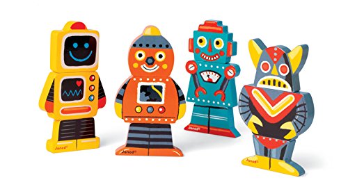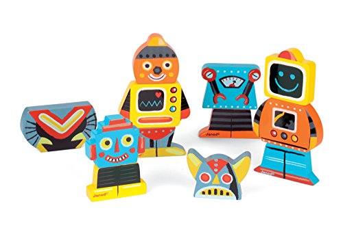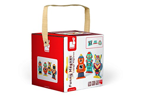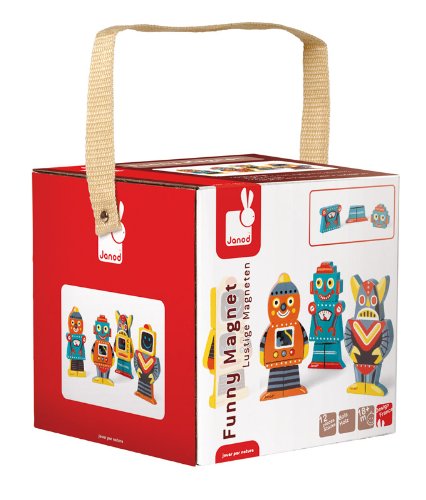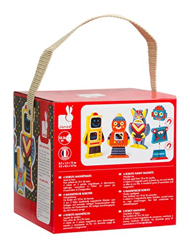 Janod Robots Magnets are quirky and cool. These chunky wooden pieces are magnetic and can be placed together in their correct sequence to form a robot or mix them up to create your own machine! Includes 4 robots with a retro feel, each with 3 pieces - head, body and legs and they are terrific for developing creativity and aptitude. Recommended for children 2 years of age and older.Feature