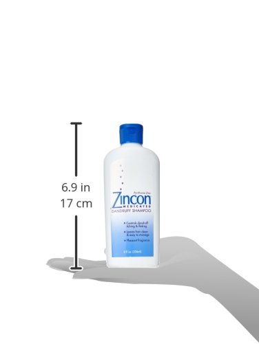 -. Binding : Health and Beauty -. Brand : Zincon -. Feature : Zincon medicated dandruff hair shampoo controls dandruff flaking while leaving hair clean, shining and easy to manage. / It reduces and helps eliminate scalp itching, flaking and scaling associated with dandruff and seborrheic dermatitis. / The shampoo that is effective against dandruff, yet gently on your hair. / It is the dandruff shampoo you can make your regular shampoo. -. Label : ZINCON -. Manufacturer : ZINCON -. ProductGroup : Health and Beauty -. ProductTypeName : HEALTH_PERSONAL_CARE -. Publisher : ZINCON -. Studio : ZINCON -. Title : ZINCON SHAMPOO 8OZ