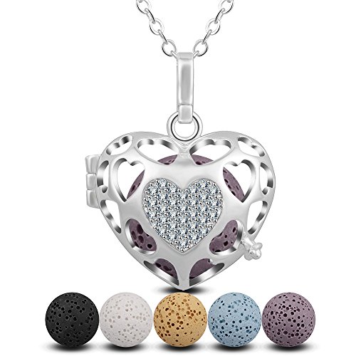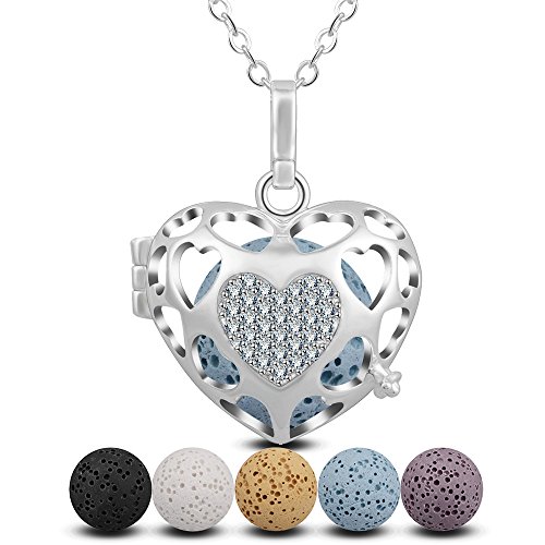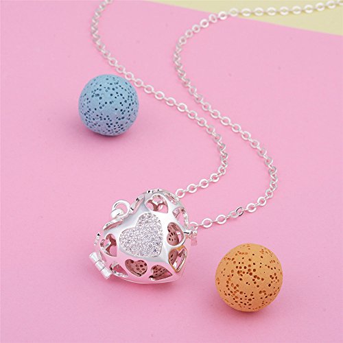 INFUSEU Heart Crystals Diffuser Necklace + 5PCS Lava Rock Stone for Women Essential Oil Aromatherapy Jewelry (Silver)