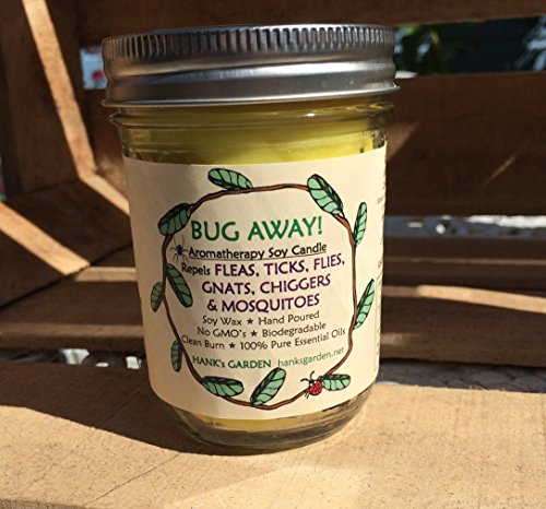 Studio : Hank's Garden Publisher : Hank's Garden Binding : Health and Beauty Product Description BUG AWAY! Soy Candle -- repels INSECTS, such as FLEAS, TICKS, FLIES, GNATS, CHIGGERS MOSQUITOES -- Smells Great, Repels Insects adds light and ambiance to patio, yard, deck, etc.-- EARTH SAFE = LIFE SAFE -- 8 oz Large Jar Burning Time: 40-50 hours -- Made with Essential oils of Citronella, Lemongrass, Basil, Cedarwood, Rosemary, Peppermint and Eucalyptus. -- CAUTION: Never leave unattended while burning. Trim wick between uses. Jar gets really hot during burn time. --- Remove paper label. 0