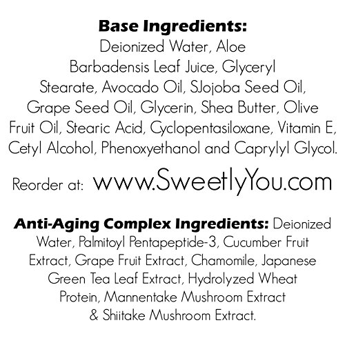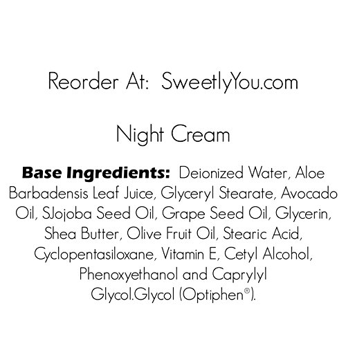 -. Binding : Misc. -. Brand : Sweetly You -. Color : Night Cream -. Feature : Helps decrease wrinkle depth, density, and volume. Also helps increase elastin fiber density and thickness and improved regularity of collagen IV, both critical for smooth, supple skin. Contains an alternative to Retinol. / SImilar base to our Day Cream with Aloe Vera Gel, Jojoba, Avocado and Grapeseed oils, with African Shea Butter, Vegetable Glycerine and Vitamin E. / Perfect for nightly care in dry arid climates or even fan forced heat in winter. / Featuring a slightly thicker feel and more hydrating properties. Outstanding quality, including more natural oils and a lighter color from using non-solvent extracted Jojoba. / Our highly emolient Night Cream is great for any skin type and moisturizes without leaving a greasy feel. -. Label : Sweetly You -. Manufacturer : Sweetly You -. ProductGroup : Beauty -. ProductTypeName : BEAUTY -. Publisher : Sweetly You -. Size : 2 ounce -. Studio : Sweetly You -. Title : Sweetly You Night Cream - Fragrance Free - 2oz Super Moisturizing Anti-Aging, and Anti-Wrinkle complex variations available. Helps to visibly reduce lines and wrinkles.