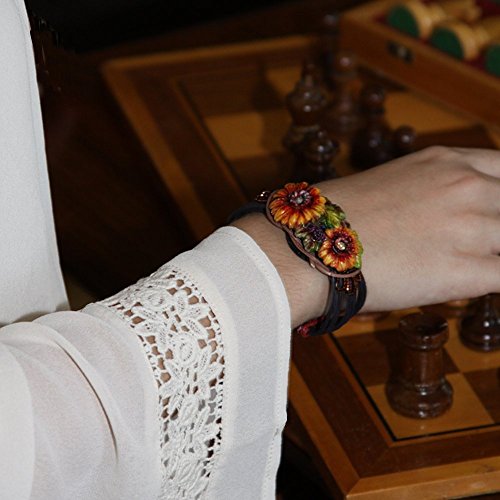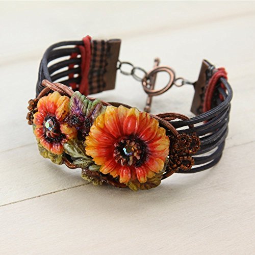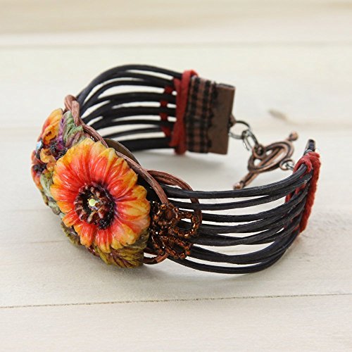 -. Title : Daisy Flower Cuff Bracelet Rhinestone Wicker Hand Painted by Jinglebirds