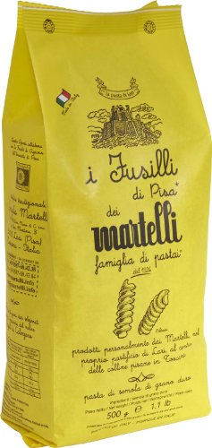 -. Binding : Misc. -. Brand : Martelli -. EAN : 8018048000090 -. Feature : An artisanal pasta made in Tuscany by the Martelli family / Produced locally with 100% Italian premium durum wheat / Bronze die extrusion and long drying create an incredible texture and porousness for catching sauce / Unique shape perfect for holding chunkier sauces and offering an unmistakable mouth-feel / A package of 500 gr - 1.1 lb -. IsAdultProduct : 0 -. PackageQuantity : 1 -. ProductGroup : Grocery -. ProductTypeName : GROCERY -. Title : Fusilli di Pisa - Martelli Pasta - Tuscany - 1.1 lb