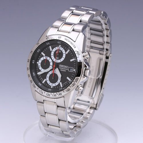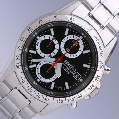심플한디자인가 매력적인 1/20 초단위로 12시간까지 계측 가능한 세이코 크로노그래프 베이직 모델.12 시의 위치에 크로노1/20초침,6 시의 위치에 크로노 분침과 크로노 시침,9 시의 위치에 통상 초침을 배치.본 모델은 베젤에 타키 meter를 준비 있습니다.