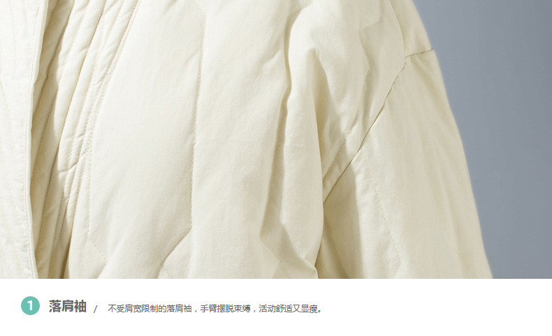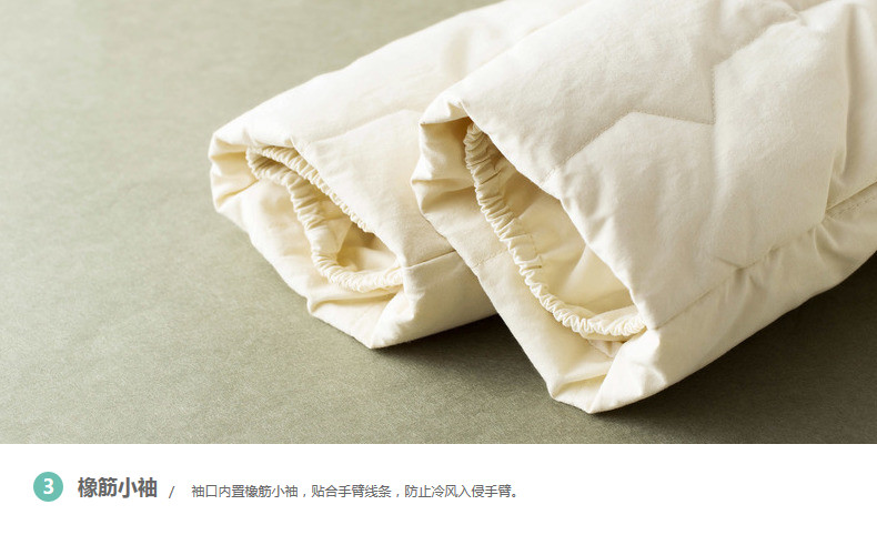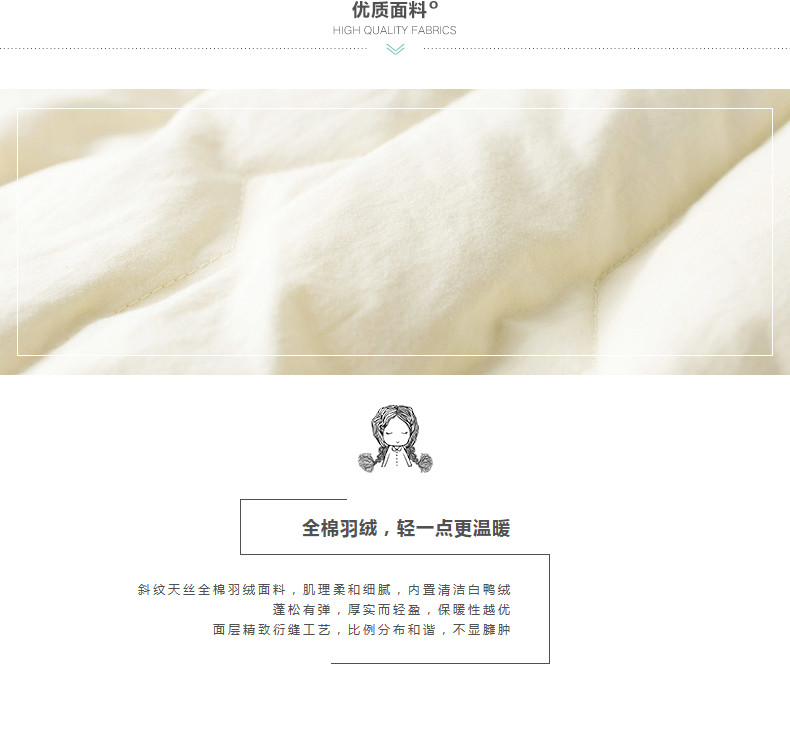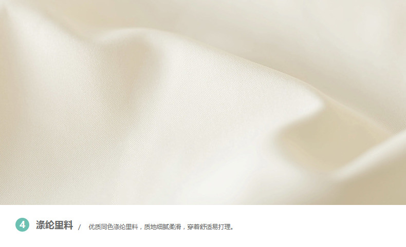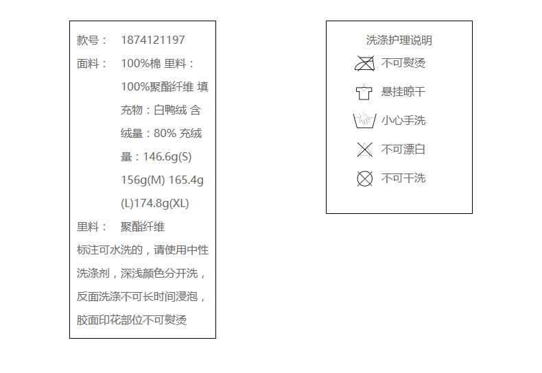 100%棉 里料:100%聚酯纤维 填充物:白鸭绒 含绒量:80% 充绒量:146.6g(S)156g(M) 165.4g(L)174.8g(XL)