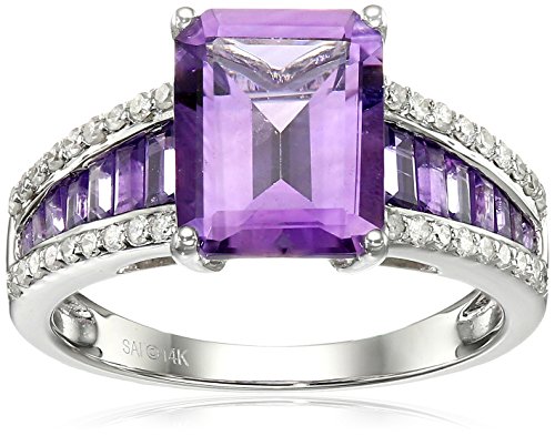 -. Binding : Jewelry -. Brand : Amazon Collection -. Color : Purple -. Department : womens -. EAN : 0032964050296 -. Feature : 14k white gold ring featuring emerald-cut gemstone in prong setting / Diamond-set band with row of gemstones at center / The natural properties and composition of mined gemstones define the unique beauty of each piece. The image may show slight differences to the actual stone in color and texture. / Gemstones may have been treated to improve their appearance or durability and may require special care. / All our diamond suppliers confirm that they comply with the Kimberley Process to ensure that their diamonds are conflict free. / Imported -. Label : The Aaron Group - HK DI -. Manufacturer : The Aaron Group - HK DI -. Model : 53150V7A1EG0 -. MPN : 53150V7A1EG0 -. PartNumber : 53150V7A1EG0 -. ProductGroup : Jewelry -. ProductTypeName : FINERING -. Publisher : The Aaron Group - HK DI -. Studio : The Aaron Group - HK DI -. Title : 14k White Gold Amethyst and Diamond (1/5cttw, H-I Color, I2-I3 Clarity) Ring, Size 7 -. UPC : 032964050296